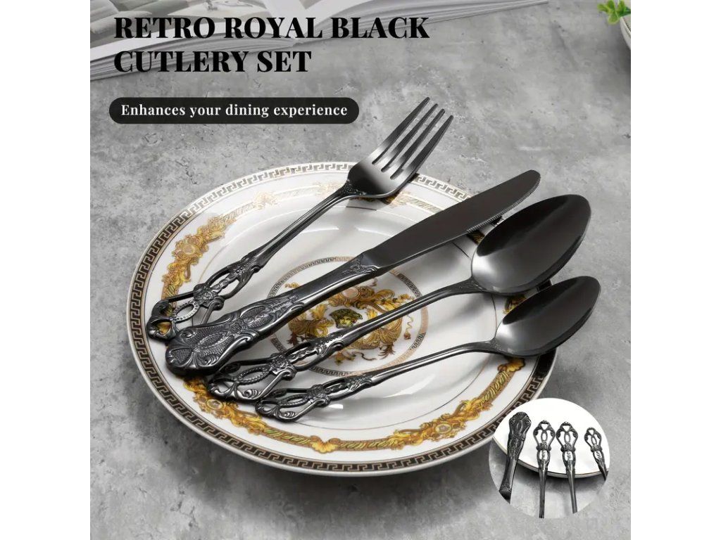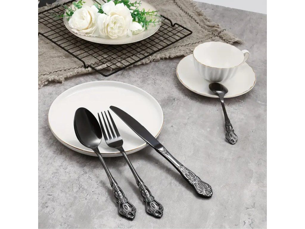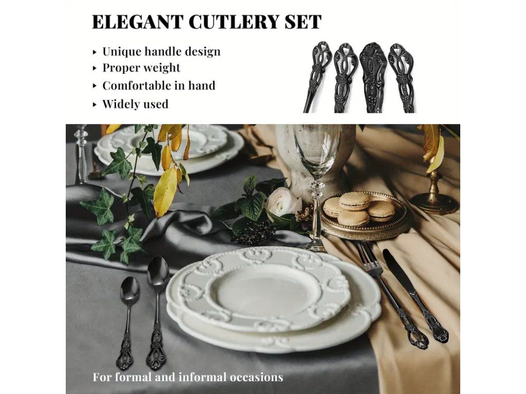 32dílná černá gotická sada příborů kombinuje výrazný design s praktickou funkčností. Sada obsahuje kompletní servis pro 8 osob — nože, vidličky, lžíce a dezertní příbory — celkem 32 kusů. Každý kus je vyroben z kvalitní nerezové oceli s odolnou černou povrchovou úpravou a propracovanými rukojetěmi inspirovanými gotickým stylem, které dodávají stolování osobitý a elegantní vzhled. Povrch příborů je matný, odolný proti opotřebení a snadno se udržuje; doporučuje se dodržovat pokyny výrobce pro mytí v myčce, aby se zachoval původní vzhled. Ergonomický tvar a vyvážení příborů zajišťují pohodlné držení a každodenní použitelnost i pro slavnostní příležitosti. Tato sada je vhodná pro domácí použití, restaurace se stylovým interiérem i jako netradiční dárek pro milovníky alternativní estetiky. Přineste do interiéru sofistikovanou temnou eleganci s touto kompletní 32dílnou černou gotickou sadou příborů.Buďte první, kdo napíše příspěvek k této položce.