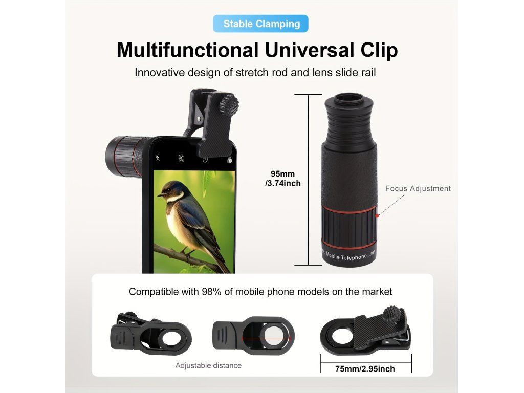 Teleobjektiv pro mobilní telefony umožňuje zachytit vzdálené objekty s vysokým přiblížením a promění váš telefon v praktický dalekohled Je ideální pro fotografování přírody sportu i koncertů Zvětšení 32x přiblížení pro detailní záběry na velkou vzdálenost vhodné pro pozorování i focení Kompatibilita univerzální klip pro většinu smartphonů snadné upevnění bez složité instalace Konstrukce odolný ABS plast optické sklo s vícevrstvou úpravou jasný a čistý obraz Příslušenství součástí balení stativ lepší stabilita při focení vhodné pro delší expozice Využití fotografování přírody sportovní události koncerty a cestování pozorování vzdálených objektůBuďte první, kdo napíše příspěvek k této položce.