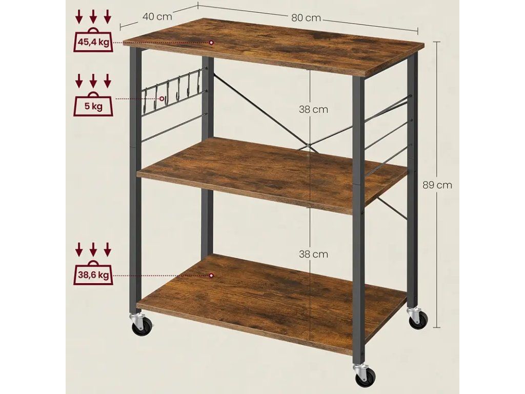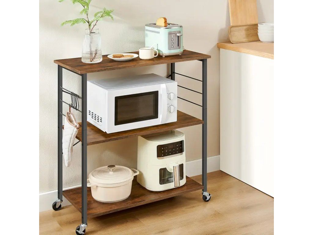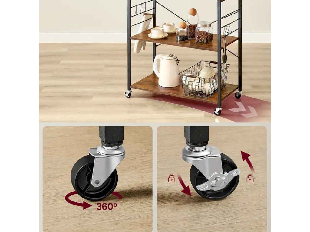 Praktický třípatrový kuchyňský regál na kolečkách v rustikálním provedení hnědé desky a černé konstrukce je ideálním doplňkem do moderních i tradičních kuchyní. Stabilní kovový rám s odolným povrchem zajišťuje dlouhou životnost, zatímco dřevěné police s rustikálním odstínem dodávají nábytku teplý a přirozený vzhled. Kolečka s brzdou umožňují snadné přemístění regálu podle potřeby a zároveň pevné zafixování na místě. Regál nabízí tři prostorné police vhodné pro uložení kuchyňských spotřebičů, košíků s potravinami, nádobí nebo kuchyňských doplňků. Konstrukce je navržena tak, aby kombinovala pevnost a praktickou funkčnost, přičemž kompaktní rozměry nezabírají příliš místa a umožňují umístění vedle linky, sporáku nebo v rohu místnosti. Výhody: - Mobilita díky kolečkům s brzdou - Robustní kovový rám v černém provedení - Tři prostorné police v rustikální hnědé barvě - Vhodné pro různé účely: skladování potravin, nádobí nebo kuchyňských spotřebičů - Snadná údržba a odolné materiály Tento třípatrový regál představuje praktické a stylové řešení pro organizaci kuchyně, které kombinuje funkčnost s estetickým rustikálním designem.Buďte první, kdo napíše příspěvek k této položce.