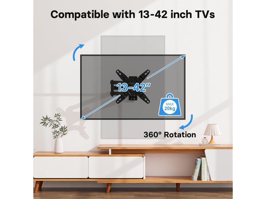 • Vhodné pro ploché i zakřivené LED, LCD, OLED obrazovky • Úhlopříčka: 13” až 42” • Maximální zatížení: 20 kg (44 lbs) • VESA standardy: 75×75, 100×100, 100×200, 200×100, 200×200 mm Pohyblivost: • Náklon: ±10° • Otočení: ±90° do stran • Rotace: 360° • Vysunutí od zdi: 2.7” až 15.7” (cca 7–40 cm)Doplňkové parametry