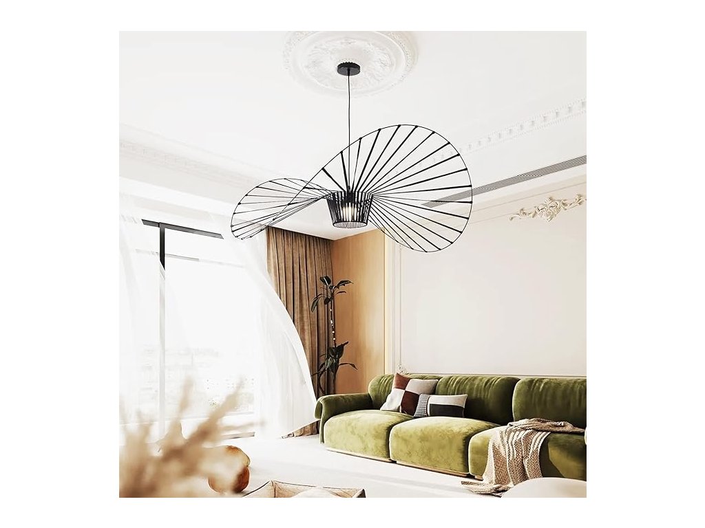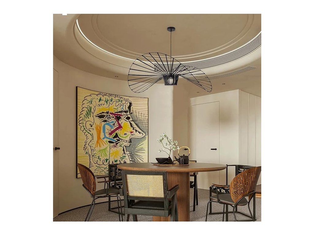 Elegantní retro/vintage stropní lustr / závěsné světlo v kreativním designu ve tvaru slamáku. Lustr je inspirovaný rustikálním a boho stylem – vypadá jako stylizovaný francouzský klobouk a hodí se do obývacích pokojů, jídelních prostor, kaváren nebo venkovských interiérů. Hlavní vlastnosti: Design: originální tvar slamáku / klobouku – rustikální boho styl. Použití: vhodné pro obývací pokoj, jídelnu, kavárnu, venkovské interiéry. Materiál: lehké a odolné materiály (kombinace pružné tkaniny a sklolaminátu / podobných materiálů).Doplňkové parametry