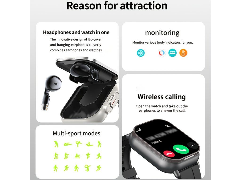 Unikátní kombinace 2v1! Chytré hodinky D8 TWS s integrovanými bezdrátovými sluchátky spojují moderní technologie, hudbu a fitness funkce do jednoho zařízení. Ideální řešení pro aktivní životní styl bez zbytečných kabelů. ? 2v1 řešení: • chytré hodinky + bezdrátová sluchátka • sluchátka uložená přímo v těle hodinek • vždy po ruce bez nutnosti nosit další pouzdro ? Hlavní funkce: • Bluetooth volání • přehrávání hudby • notifikace z telefonu ? Sport a zdraví: • sledování sportovních aktivit • krokoměr a kalorie • monitoring základních zdravotních údajů ? Praktické vlastnosti: • nabíjení sluchátek přímo v hodinkách • dlouhá výdrž baterie • kompatibilita s Android i iOS ? Využití: • sport a trénink • cestování • každodenní nošení • hands-free volání a hudbaBuďte první, kdo napíše příspěvek k této položce.