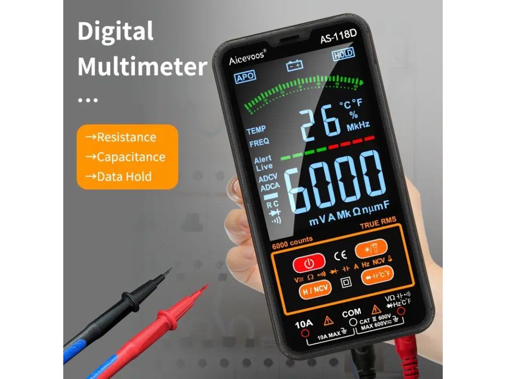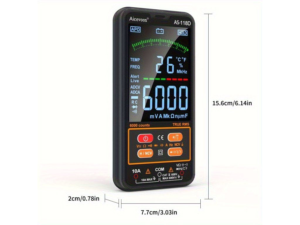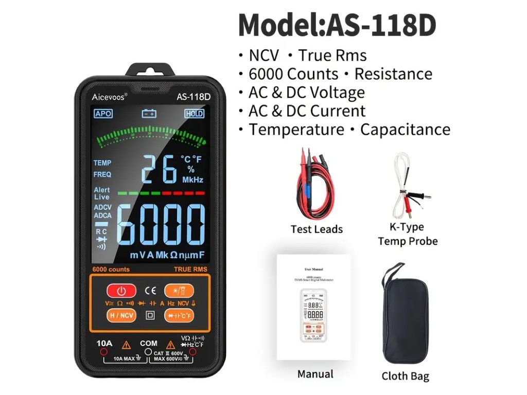 Digitální multimetr Aicevoos AS-118D je přesný a všestranný měřicí přístroj vhodný pro profesionální i domácí použití. Díky moderním funkcím umožňuje rychlé a bezpečné měření elektrických veličin. Hlavní funkce: True RMS – zajišťuje přesné měření střídavých signálů i u nelineárních zátěží. LCD displej – 4palcový barevný displej s rozlišením 6000 counts pro přehledné a přesné zobrazení naměřených hodnot. Smart Mode – automaticky rozpozná měřenou veličinu, což zjednodušuje práci s přístrojem. Měření – umožňuje měřit AC/DC napětí a proud, odpor, kapacitu, frekvenci a teplotu. Bezpečnost – certifikace CAT III 600V a ochrana proti přetížení zajišťují bezpečné používání.Buďte první, kdo napíše příspěvek k této položce.