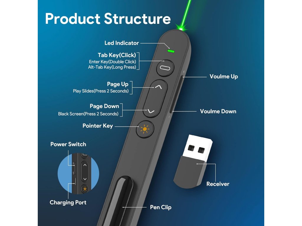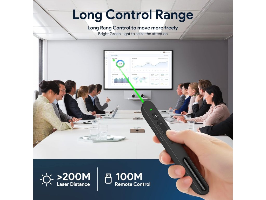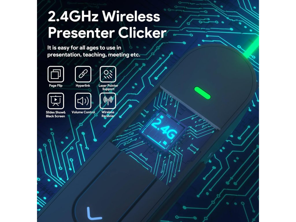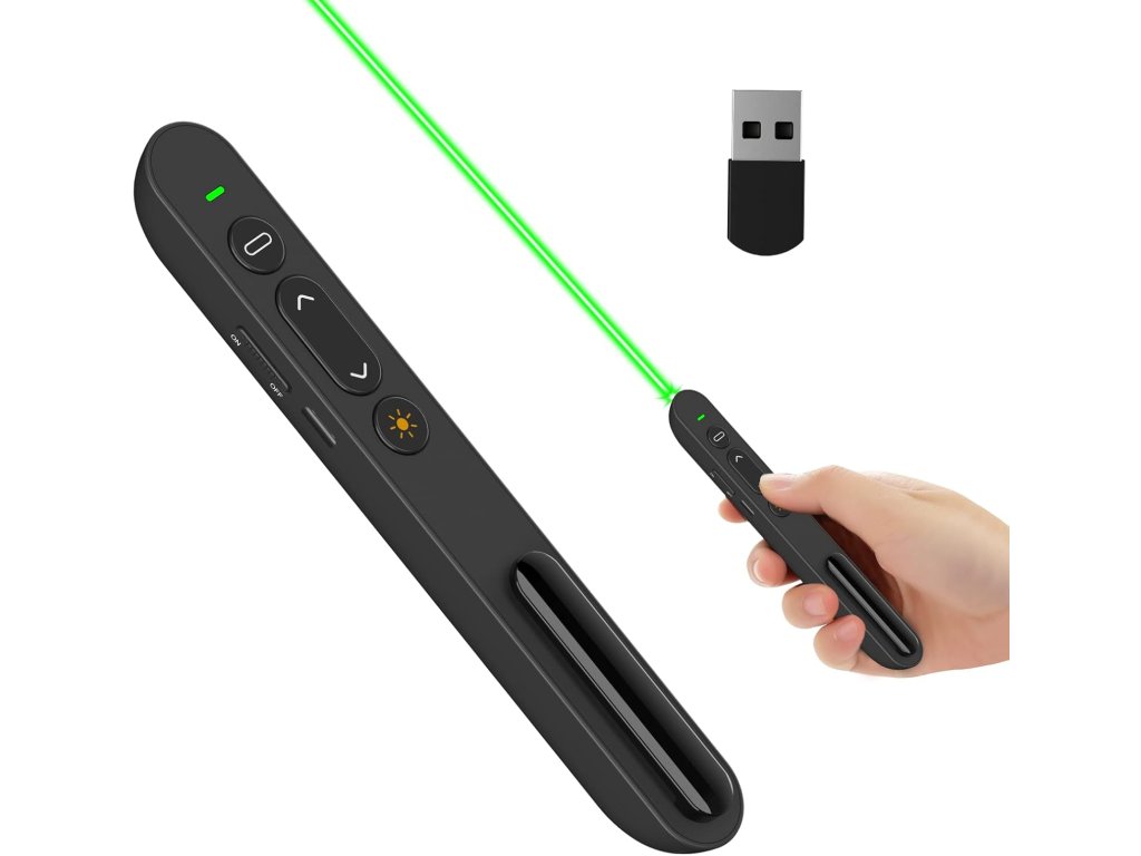 • Typ: bezdrátový ovladač pro prezentace • Připojení: 2.4 GHz USB přijímač (Plug & Play) • Dosah: až 100 metrů • Funkce:• Ovládání snímků (vpřed/zpět) • Hyperlink, Enter, Tab, Esc, Black screen • Laserové ukazovátko (červený bod) • Kompatibilita: Windows, macOS, Linux • Podporované aplikace: PowerPoint, Keynote, Prezi, Google Slides • Napájení: 1× AAA baterie (není součástí) • Materiál: ABS plast • Barva: černá • Rozměry: 13.5 × 2.5 × 1.5 cm • Hmotnost: cca 30 g • Obsah balení: prezentér, USB přijímač, návod • Výrobce: Doosl • Model: DSIT040BDoplňkové parametry