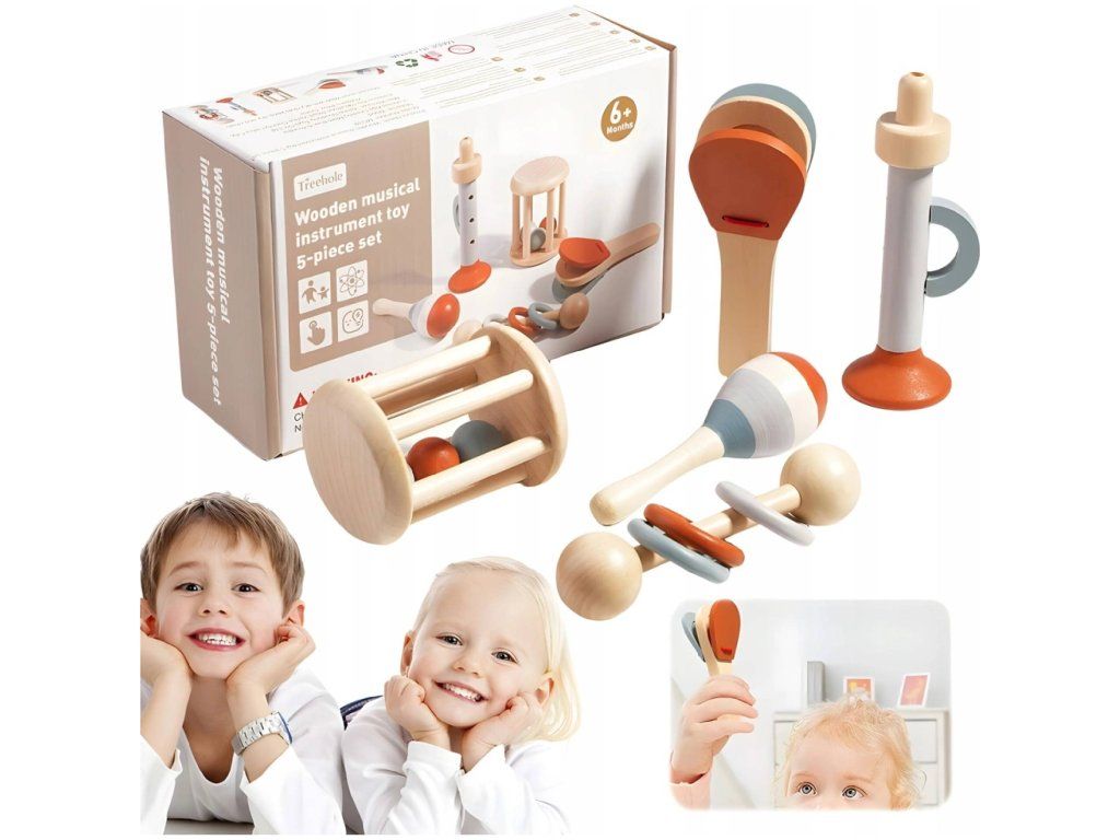 Dřevěná hudební sada pro děti obsahuje 5 různých nástrojů, které pomáhají rozvíjet rytmus, sluch i motoriku nejmenších. V sadě obvykle najdeš kombinaci klasických klasických dětských hudebních nástrojů, jako jsou: dřevěné xylofonové klapky tamburína kastaňety dřevěné bubínky malé rytmické nástroje (ráčny / chřestítka) Hudební nástroje jsou vyrobeny z kvalitního a bezpečného dřeva, vhodné pro malé děti. Díky jednoduchému designu a příjemným barvám jsou ideální pro první seznámení s hudbou a rytmem. Sada je vhodná pro děti od cca 3 let a je ideální pro hru doma, ve školce nebo na hudební aktivity. Hra na tyto nástroje pomáhá rozvíjet sluchové vnímání, rytmus, koordinaci ruky a oka a kreativitu.Buďte první, kdo napíše příspěvek k této položce.