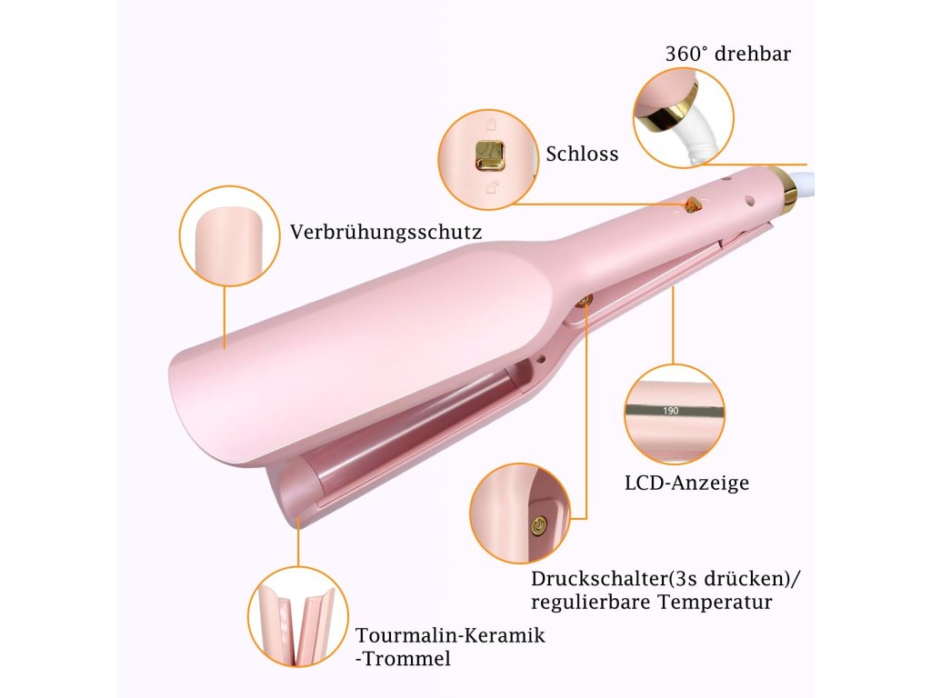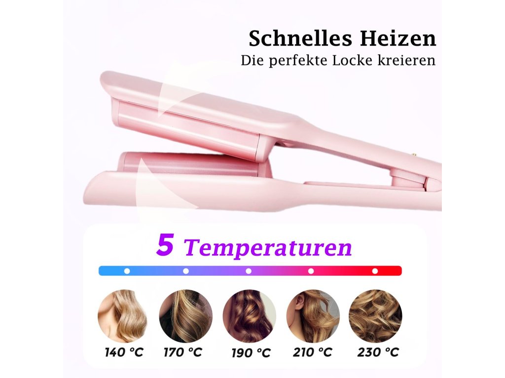 Profesionální kulma s keramickým povrchem určená k vytváření různých typů vln – od jemných plážových po výrazné „mermaid“ vlny. Vhodná pro krátké i dlouhé vlasy. Specifikace: • Průměr: 32 mm • Teplotní rozsah: 140 °C až 230 °C (5 úrovní nastavení) • Materiál: keramika s technologií PTC pro rovnoměrné zahřívání • Napájení: 110–230 V, 50 Hz • Výkon: 70 W • Délka kabelu: cca 1,7 m, otočný o 360° • Rozměry: 34,5 × 6 × 6 cm • Hmotnost: cca 650 g • Barva: růžová Funkce: • LED displej pro zobrazení teploty • Ochrana proti přehřátí • Rychlé zahřátí • Ergonomický design pro snadné použití • Vhodná pro domácí i profesionální stylingBuďte první, kdo napíše příspěvek k této položce.
