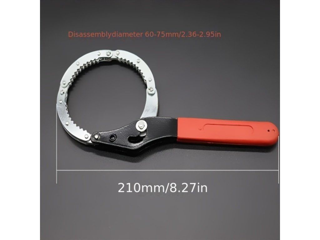 Klíč na olejové filtry je praktický nástroj určený k snadnému uvolnění nebo dotažení spin-on olejových filtrů. Díky kovovému pásku, který se obepne kolem filtru a při otáčení se utáhne, umožňuje bezpečné uchopení i mastných nebo pevně dotažených filtrů. Hlavní vlastnosti: Průměr demontáže: Nastavitelný od 60 do 75 mm (2,36–2,95 palce). Celková délka: Přibližně 210 mm (8,27 palce). Funkce: Kovový pásek vytváří napětí kolem filtru pro bezpečné uchopení při otáčení. Použití: Ideální pro automobilové olejové filtry, které nelze uvolnit rukou.Buďte první, kdo napíše příspěvek k této položce.