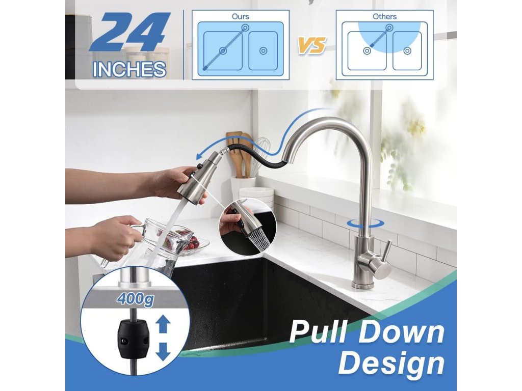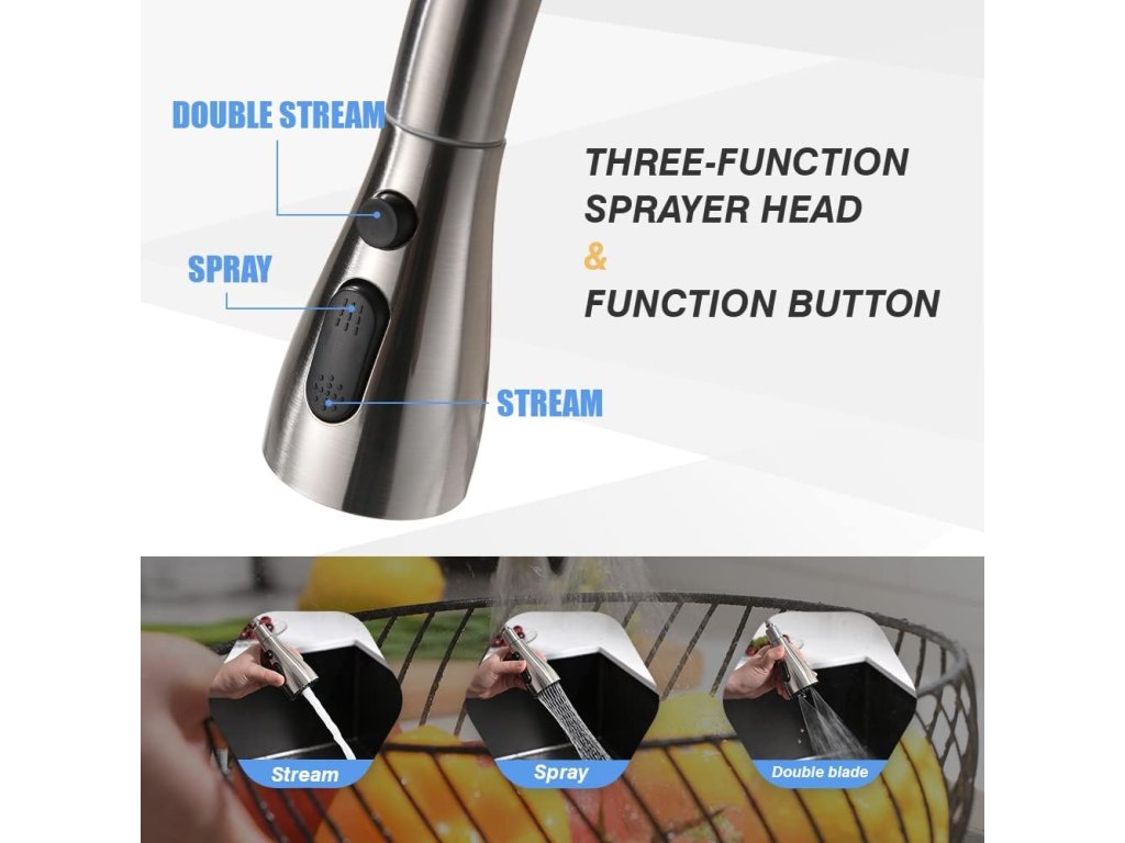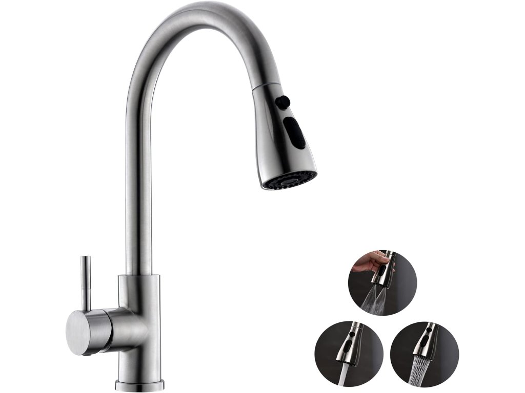 • Materiál: nerezová ocel, odolná vůči korozi a snadno se čistí • Design: komerční vzhled s pružinovým ramenem a výsuvnou sprchou • Funkce: více režimů proudění vody – klasický proud, sprcha, pauza • Ovládání: jednopákové, umožňuje regulaci teploty i průtoku • Instalace: vhodná pro většinu standardních kuchyňských dřezů • Využití: ideální pro domácnosti, ale i profesionální kuchyněDoplňkové parametry