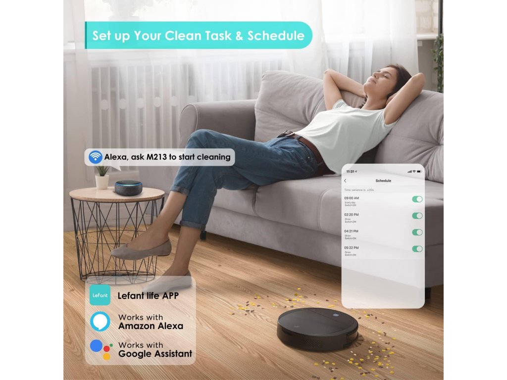 • Sací výkon: až 2200Pa – vhodný pro tvrdé podlahy, nízké koberce a zvířecí chlupy • Kompaktní design: malá výška (7,5 cm) umožňuje čištění pod nábytkem • Ovládání: přes aplikaci Lefant, hlasové ovládání (Alexa), dálkový ovladač nebo tlačítka • Režimy čištění: automatický, bodový, podél stěn, manuální – snadné přepínání podle potřeby • Technologie FreeMove 2.0: 6D infračervené senzory proti nárazu a pádu • Baterie: 2000mAh – výdrž až 100 minut, automatický návrat na nabíjecí stanici • Filtrace: HEPA filtr, 500ml prachová nádoba – snadné čištění bez zamotávání vlasů • Hlučnost: tichý provoz – přibližně jako mikrovlnná troubaBuďte první, kdo napíše příspěvek k této položce.