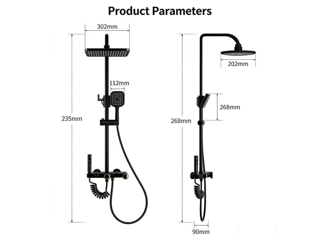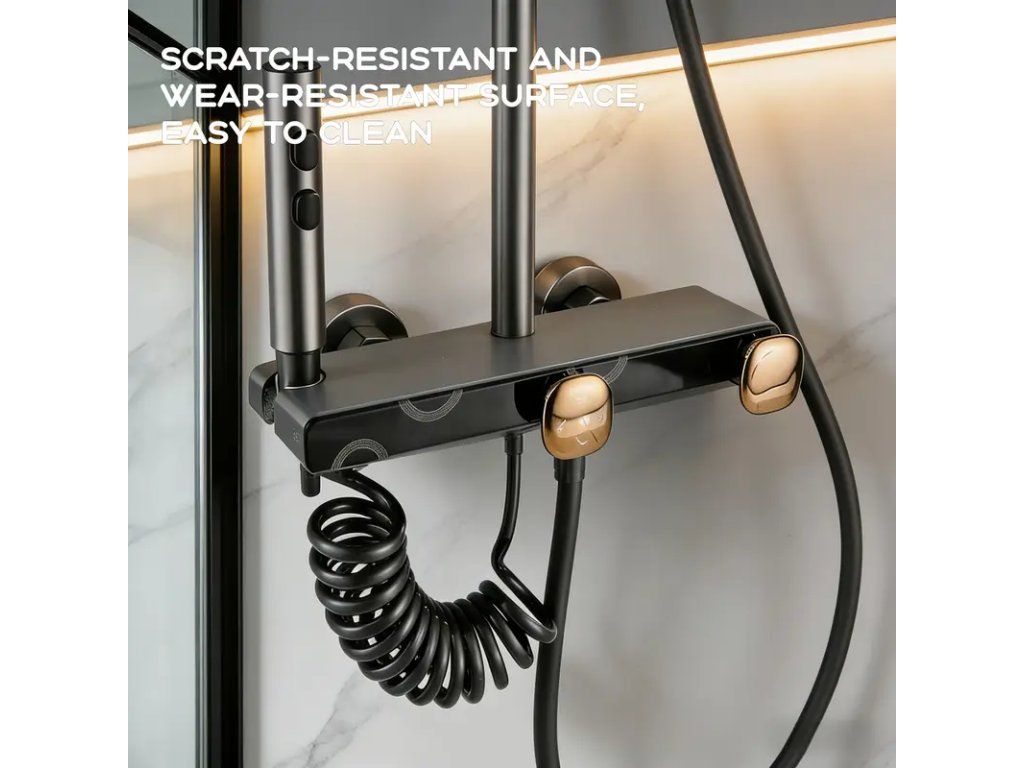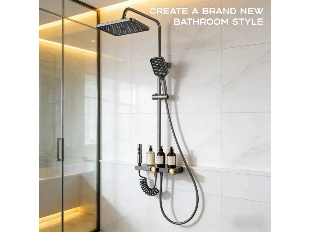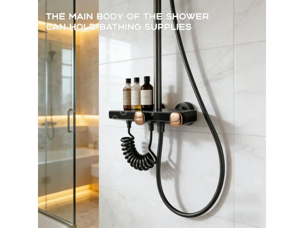 Luxusní černo‑zlatá sprchová sada s integrovanou poličkou