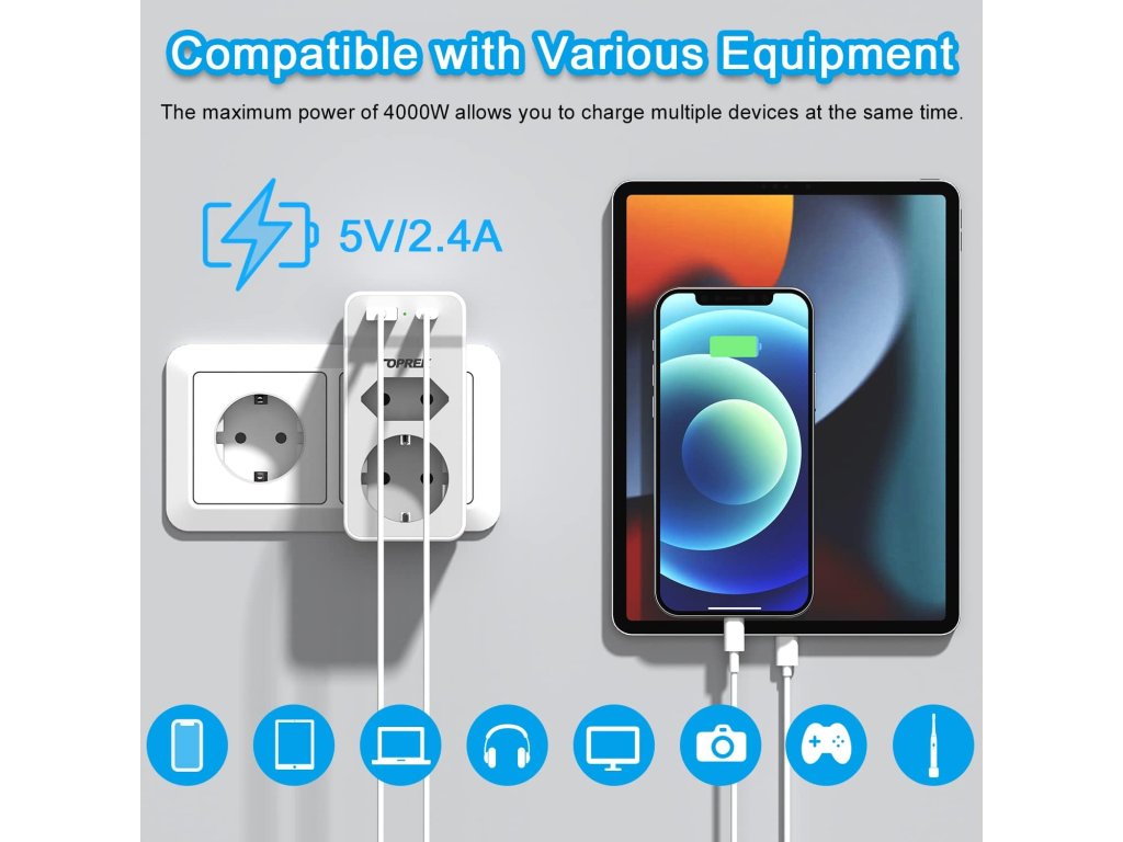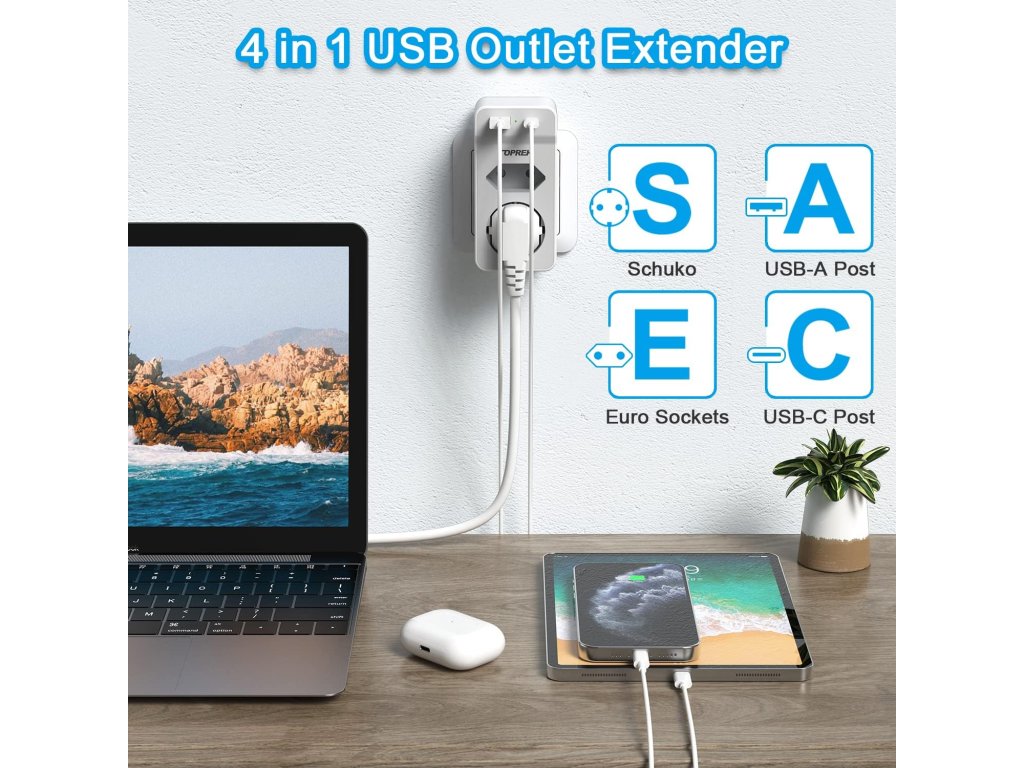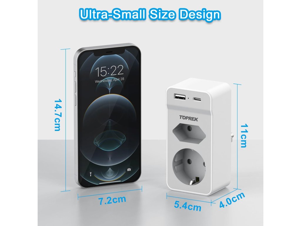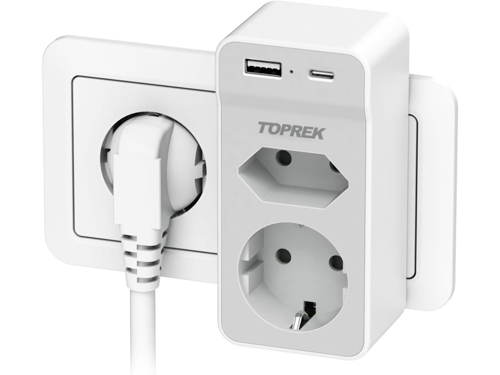 Tento kompaktní adaptér od značky TOPREK rozšiřuje jednu běžnou zásuvku na 1× Schuko (kulatá), 1× Euro (plochá) a 2× USB porty – USB-A a USB-C. Je ideální pro domácnosti, kanceláře nebo cestování, kde potřebuješ nabíjet více zařízení najednou bez zbytečných kabelů. Podporuje výkon až 4000 W / 16 A, takže zvládne i výkonnější spotřebiče. USB porty poskytují výstup 5V/2.4A, vhodné pro rychlé nabíjení telefonů, tabletů nebo sluchátek. Kompaktní rozměry (11 × 5.3 × 4 cm) a nízká hmotnost (138 g) z něj dělají ideálního společníka na cesty. Technické parametry: Zásuvky: 1× Schuko, 1× Euro USB porty: 1× USB-A, 1× USB-C (5V/2.4A) Maximální výkon: 4000 W / 16 A Napětí: 230 V Materiál: nehořlavý PC + ABS Bezpečnost: dětská pojistka Rozměry: 11 × 5.3 × 4 cm Barva: bíláBuďte první, kdo napíše příspěvek k této položce.