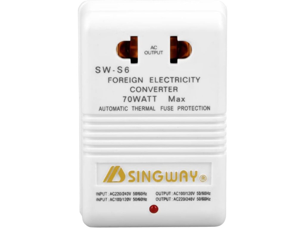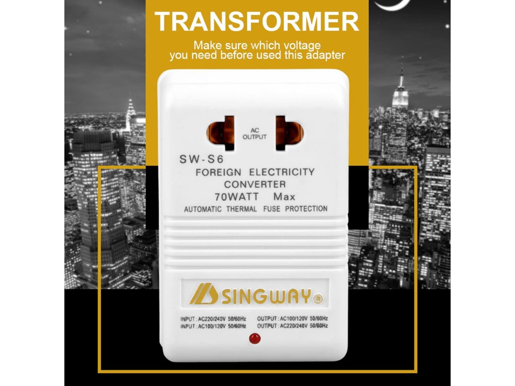 Před zakoupením tohoto produktu se prosím ujistěte, že výkon vašeho produktu je nižší než 30W; A při použití tohoto produktu by měl být spodní spínač nastaven podle popisu produktu a nesmí dojít k žádné chybě. Převodník napětí kanálu z 110/120V na 220/240V, také lze měnit z 220/240V na 110/120V. Malá velikost a lehká hmotnost, ideální na cestování kamkoliv, velmi praktická. Zvládne použití různých malých spotřebičů (pod 30W). Používá se hlavně k převodu vstupního a výstupního napětí mezi napětím v různých zahraničních zemích.Doplňkové parametry