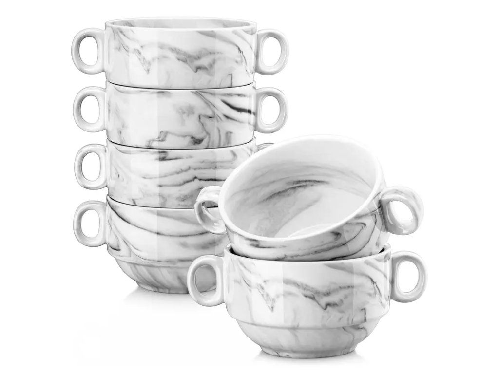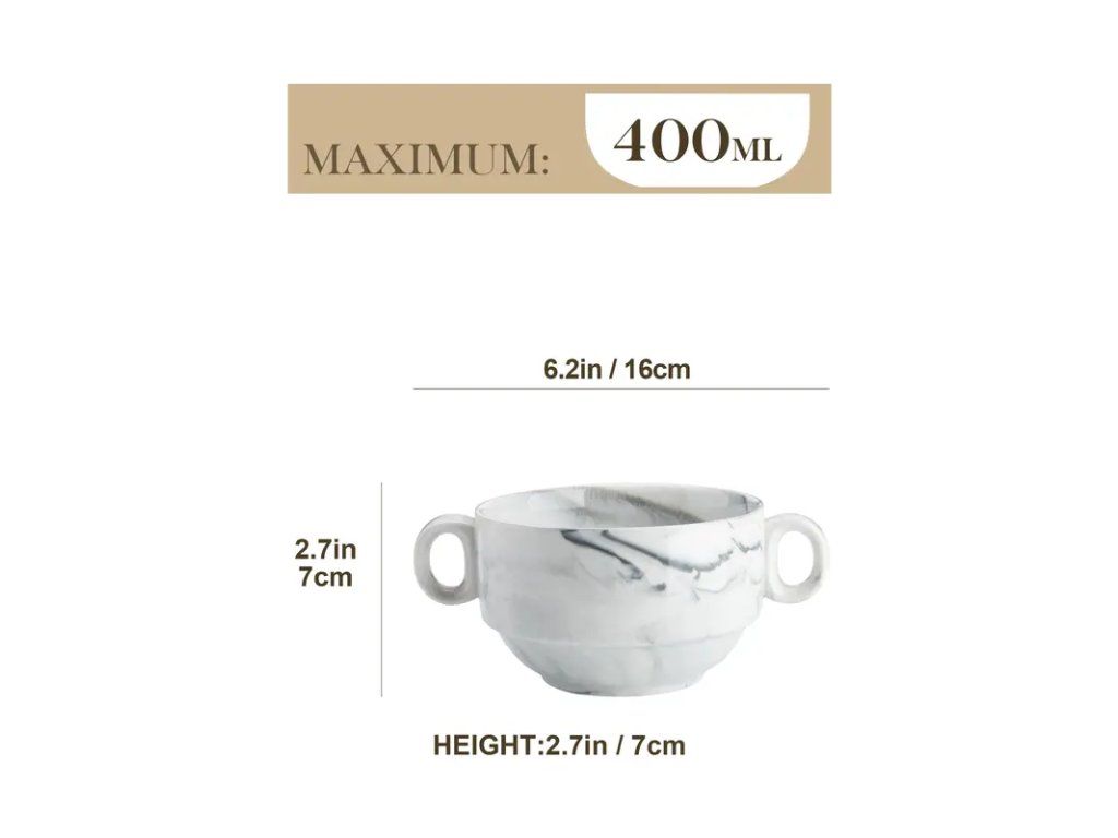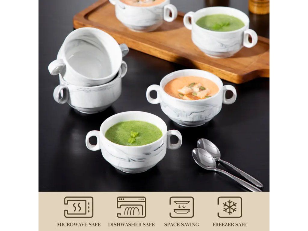 Sada 6 porcelánových misek s ouškem v mramorovém designu představuje kombinaci elegance a praktičnosti pro každodenní použití i slavnostní příležitosti. Každá miska je vyrobena z kvalitního porcelánu s jemným mramorovým vzorem, který dodává ceremoniálnímu stolování nadčasový vzhled. Ergonomické ouško zajišťuje pohodlné držení a bezpečnou manipulaci i s horkými pokrmy či nápoji. Díky odolnému povrchu jsou misky snadné na údržbu, vhodné do myčky nádobí a odolné vůči běžnému opotřebení. Sada obsahuje 6 kusů stejného designu, což oceníte při servírování polévek, dezertů, müsli nebo dipů. Neutrální mramorový motiv ladí s moderním i klasickým nádobím a umožňuje snadné doplnění stávajícího servisu. Elegantní a praktický doplněk do každé kuchyně, ideální také jako stylový dárek pro milovníky kvalitního stolování.Buďte první, kdo napíše příspěvek k této položce.