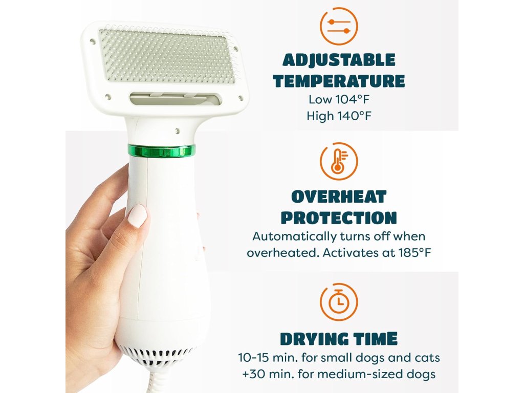 • 2v1 design: spojuje funkci kartáče a fénu – umožňuje současné česání a sušení srsti • Regulace teploty: obvykle s více stupni – šetrné k citlivé pokožce zvířat • Bezpečnost: ochrana proti přehřátí, nízká hlučnost pro pohodlné použití u domácích mazlíčků • Ergonomický tvar: snadné držení, vhodné pro delší péči • Použití: ideální pro psy, kočky a další chlupaté mazlíčky – zejména po koupání • Materiál kartáče: často s jemnými kovovými štětinami s ochrannými koncovkamiBuďte první, kdo napíše příspěvek k této položce.