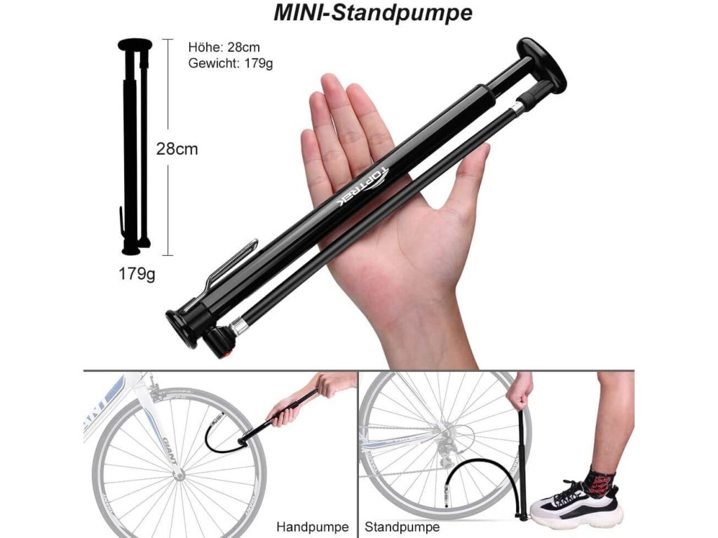 • Kompaktní a lehká: pouze 28 cm dlouhá, váží 179 g – ideální na cesty • Vysoký tlak: až 210 PSI / 14,5 bar • Kompatibilita: AV/DV/SV – Presta, Schrader, Dunlop + jehla na míče a univerzální tryska • Materiál: hliníkové tělo s anodizovaným povrchem pro vyšší odolnost • Ergonomická rukojeť: T-tvar pro pohodlné pumpování • Odolná hadice: TPU materiál, flexibilní i při −50 °C, otočná o 360°Doplňkové parametry