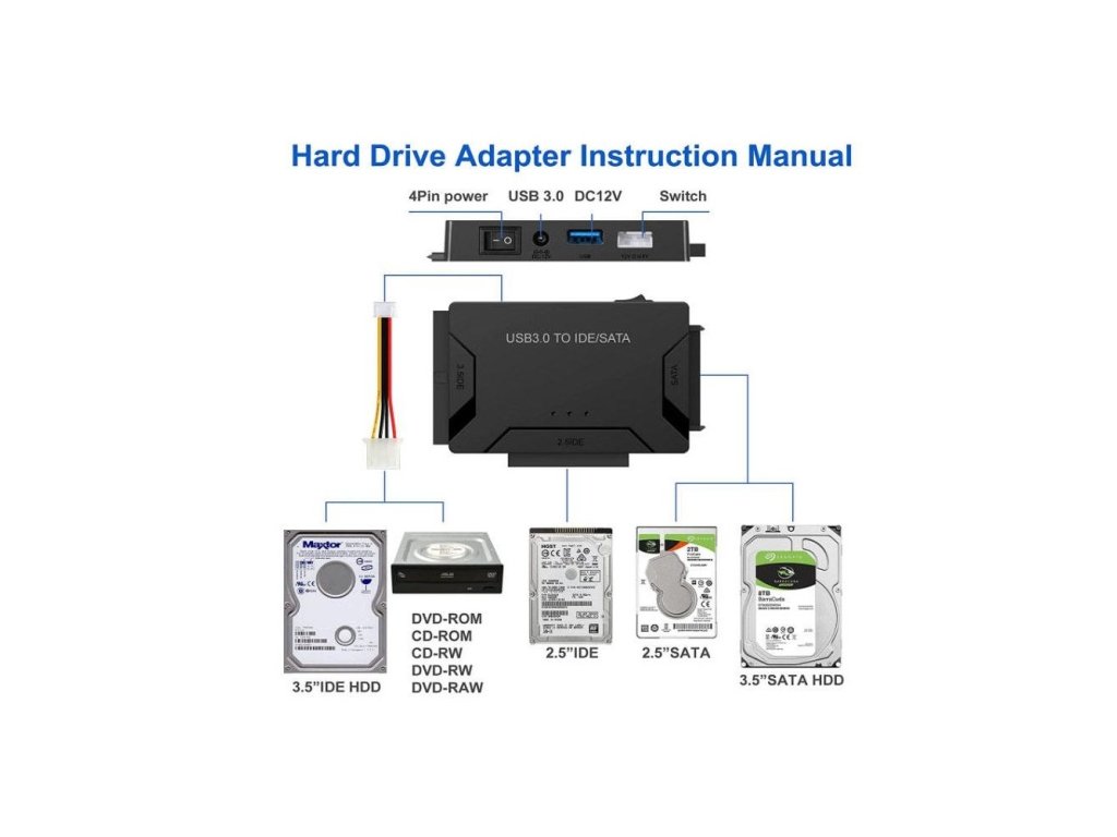 Kompatibilita: • Podporuje 2.5” a 3.5” SATA HDD/SSD • Podporuje 2.5” a 3.5” IDE disky • Funguje i s optickými mechanikami (CD/DVD-ROM, RW) • Kompatibilní s Windows XP/Vista/7/8/10, Mac OS 9/10, Linux • Podpora disků až do kapacity 6 TB Připojení a výkon: • USB 3.0 rozhraní s přenosovou rychlostí až 5 Gbps • Zpětně kompatibilní s USB 2.0 a 1.1 • Plug & Play – není potřeba instalovat ovladače • LED indikátor provozu • Vypínač pro bezpečné zapnutí/vypnutí napájení Napájení: • Externí 12V napájecí adaptér pro 3.5” disky • Součástí balení:• USB 3.0 datový kabel • 12V napájecí adaptér • Napájecí kabel 4pin (velký na malý) • Adaptér samotný Použití: • Vhodné pro zálohování dat, klonování disků, přenos souborů • Praktické řešení pro techniky, domácí uživatele i IT servisBuďte první, kdo napíše příspěvek k této položce.