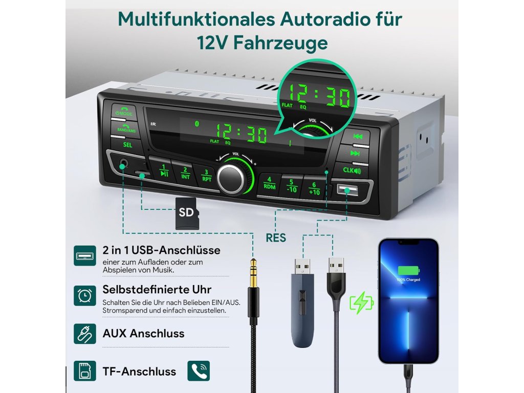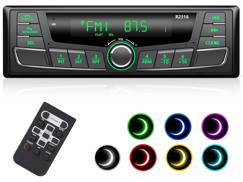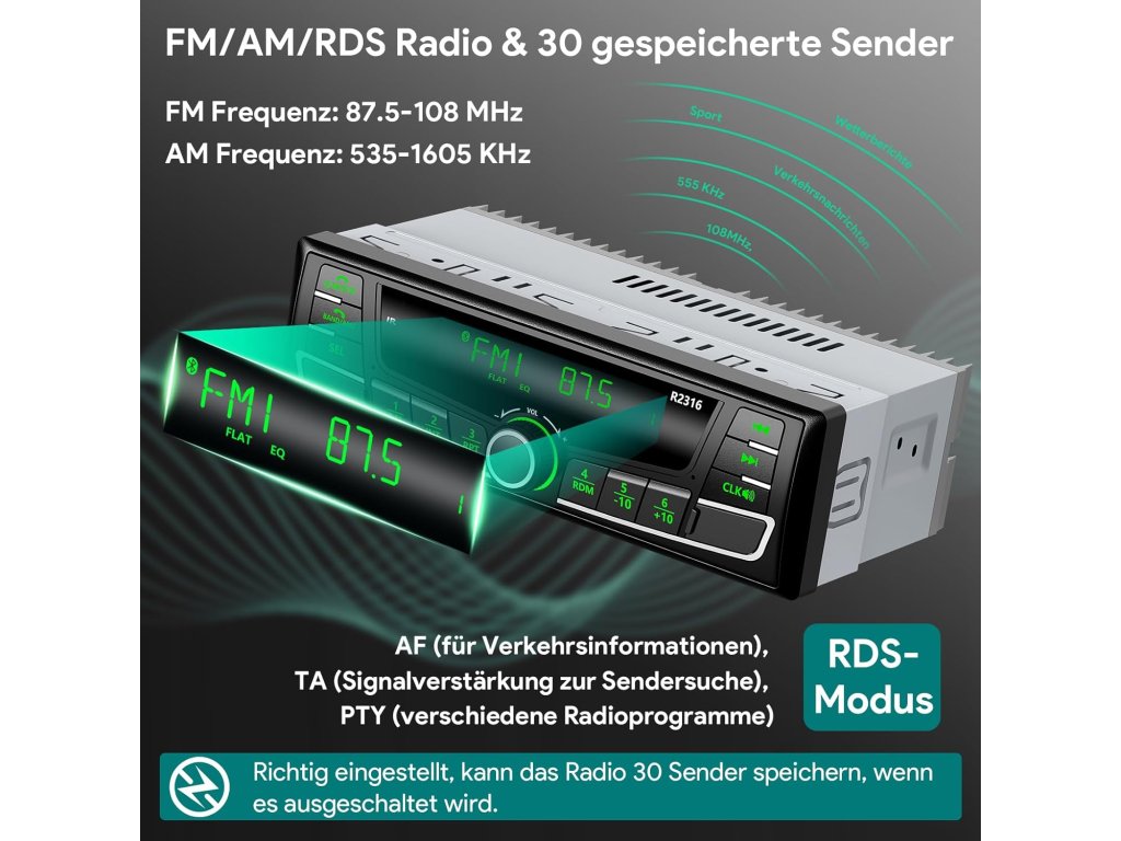 • RDS/AM/FM rádio s pamětí:• Uložení až 30 stanic (18 FM, 12 AM) • Frekvenční rozsah: FM 87,5–107,9 MHz, AM 522–1620 kHz • Bluetooth 5.0:• Stabilní připojení pro handsfree hovory • Streamování hudby z telefonu (Android/iOS) • Ovládání přes dálkové ovládání na volantu • Displej a osvětlení:• Jasný LCD displej • 7 barev podsvícení pro přizpůsobení atmosféry v interiéru • Zvukové možnosti:• Podpora formátů MP3, WMA, WAV • Nastavení basů, výšek, vyvážení • 5 režimů ekvalizéru: Pop, Klasika, Jazz, Rock, Flat • Konektivita:• USB port (2.1 A nabíjení + přehrávání hudby) • AUX vstup • Slot pro SD/TF kartu (do 32 GB) Instalace a kompatibilita: • Typ: 1 DIN (standardní velikost pro většinu vozidel) • Napájení: 12 V • Rozměry: 19 × 10,6 × 5 cm • Obsah balení: rádio, anténa, čelní panel, dálkové ovládání, montážní rámeček, kabeláž, návodBuďte první, kdo napíše příspěvek k této položce.