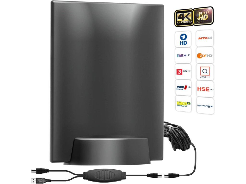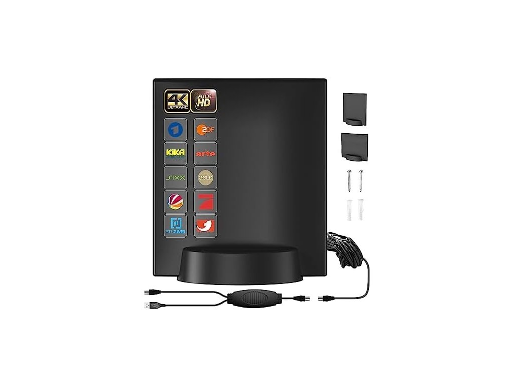 Hlavní vlastnosti: • Typ: vnitřní anténa s plochým designem • Podporované rozlišení: 4K Ultra HD, 1080p Full HD • Dosah: až 480 km (s zesilovačem) • Zesilovač: USB napájení, regulace signálu • Konektor: koaxiální (standardní TV vstup) Kompatibilita: • Vhodné pro většinu moderních televizorů s DVB-T/T2 tunerem • Podpora digitálních kanálů: ABC, CBS, NBC, FOX, PBS, CW, a další (v závislosti na lokalitě) Instalace: • Samolepicí úchyty nebo možnost zavěšení • Dlouhý koaxiální kabel (obvykle 3–5 metrů) • Plug & Play – bez nutnosti externího napájení (pouze USB)Doplňkové parametry
